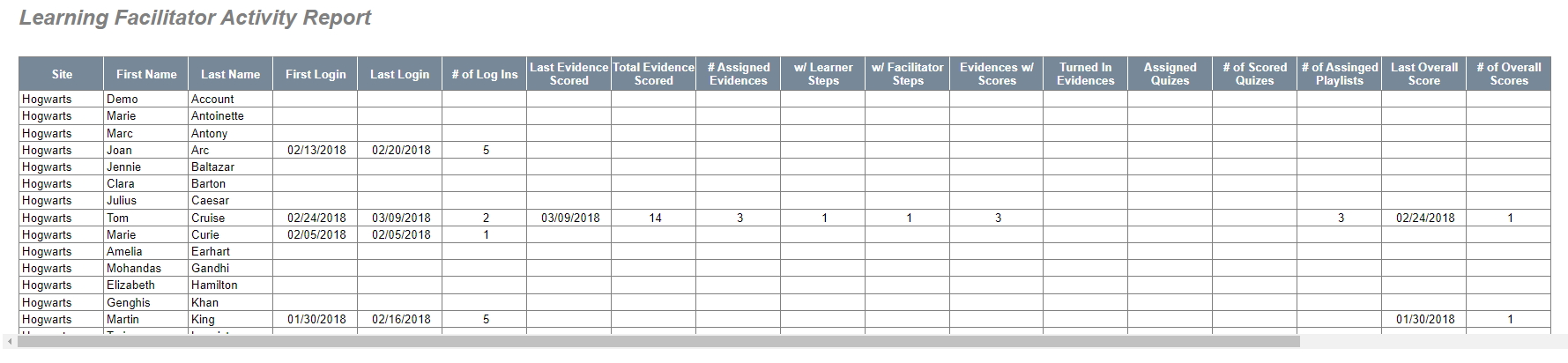 The Teacher Activity Report displays a wealth of information including when teachers have logged in, how often, which tools they do and don't use with what frequency, and the kind and amount of scores they are giving.