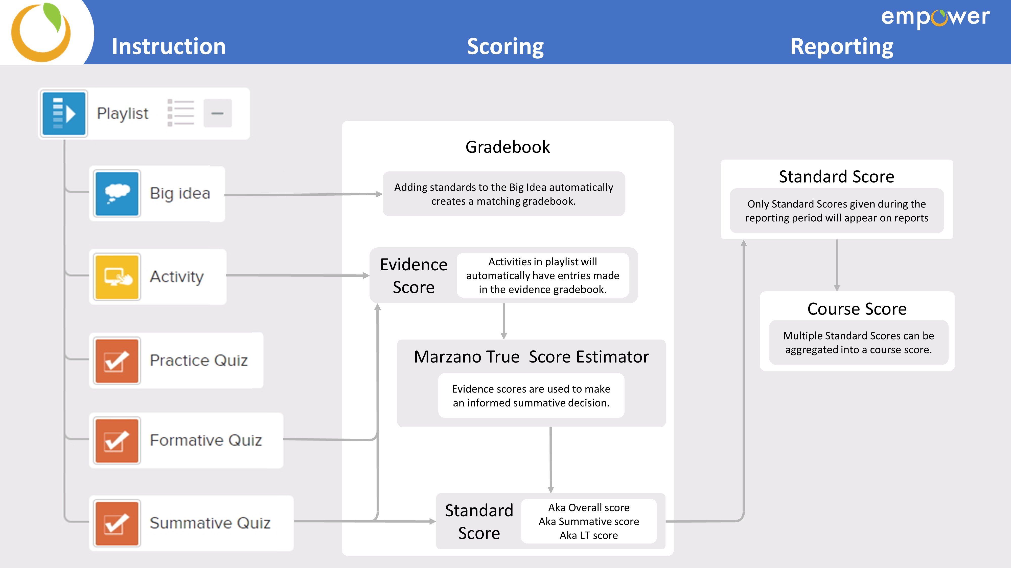 In Empower, the main idea to remember is that evidence is gathered against a proficiency scale, and that evidence score is attached to the student.