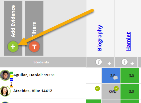 Click Add Evidence in the upper left-hand corner of the gradebook.